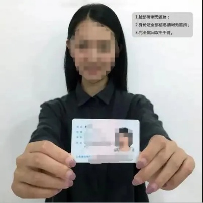 2.本人手持身份证照(拍摄时,手持本人身份证,将持证的手臂和上半身整个拍进照片,头部和肩部要端正,头发不得遮挡脸部或造成阴影,要露出五官;确保身份证上的所有信息清晰可见、完整,没有被遮挡或者被手指捏住);