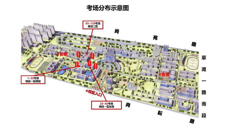 2.南门距离明远教学楼步行大约10分钟,距离修远教学楼步行大约15分钟。请各位考生合理规划出行时间,按时到达考场,开考15分钟后不再允许进入考场。
